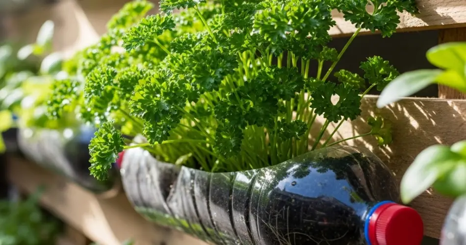Las botellas de plástico son una excelente opción para un jardín vertical de perejil.