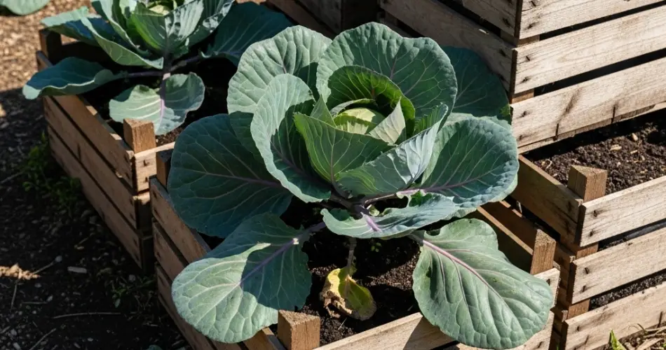 Las cajas de madera, como cajas recicladas o macetas hechas a mano, son ideales para cultivar repollo en balcones: