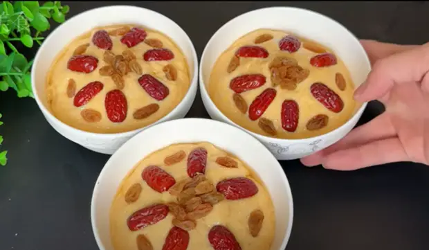 Cuando todo esté listo, vierte la masa mezclada en los pequeños boles, llenándolos hasta un 70-80% de su capacidad para que la masa tenga espacio para expandirse. La superficie de la masa puede no ser completamente lisa, pero no te preocupes. Usa una cuchara untada en aceite para alisar la superficie. Ahora es el momento de ser creativo. Coloca las pasas y los dátiles en la superficie de la masa como decoración, según tu gusto. Una vez todo esté listo, pon los boles en una vaporera ya caliente. Tápalos y comienza a contar el tiempo. Generalmente, necesitarás cocinarlos al vapor durante 20 a 25 minutos. Cuando el tiempo haya terminado, no abras la tapa de inmediato. Es mejor dejar reposar durante otros 5 minutos antes de abrirla. Al destaparlo, el aroma fresco y fragante te invadirá.
